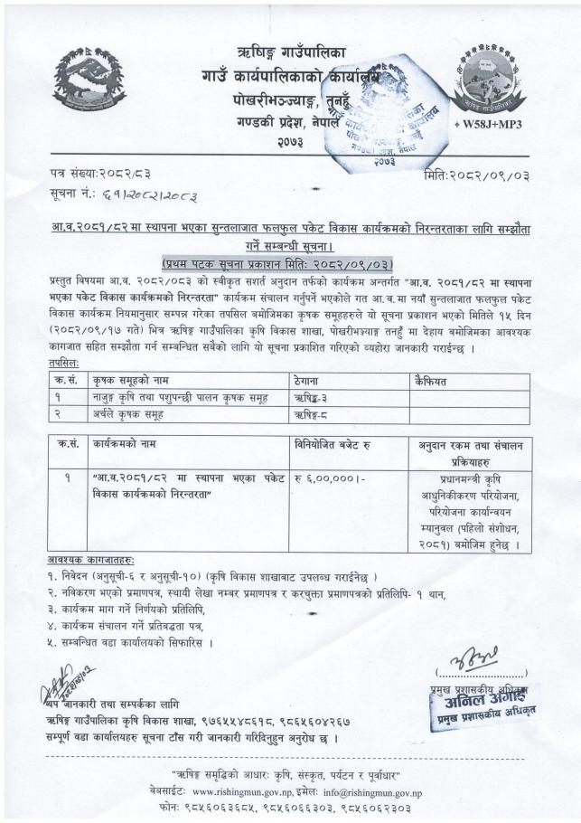 आ.व. २०८१-०८२ मा स्थापना भएका सुन्तलाजात फलफुल पकेट विकास कार्यक्रमको निरन्तरताका लागि सम्झौता गर्ने सम्बन्धी सूचना ।