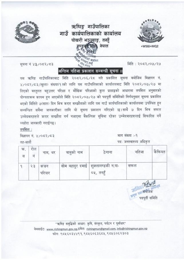 अन्तिम नतिजा प्रकाशन सम्बन्धी सूचना !! (पदः जनस्वास्थ्य अधिकृत)
