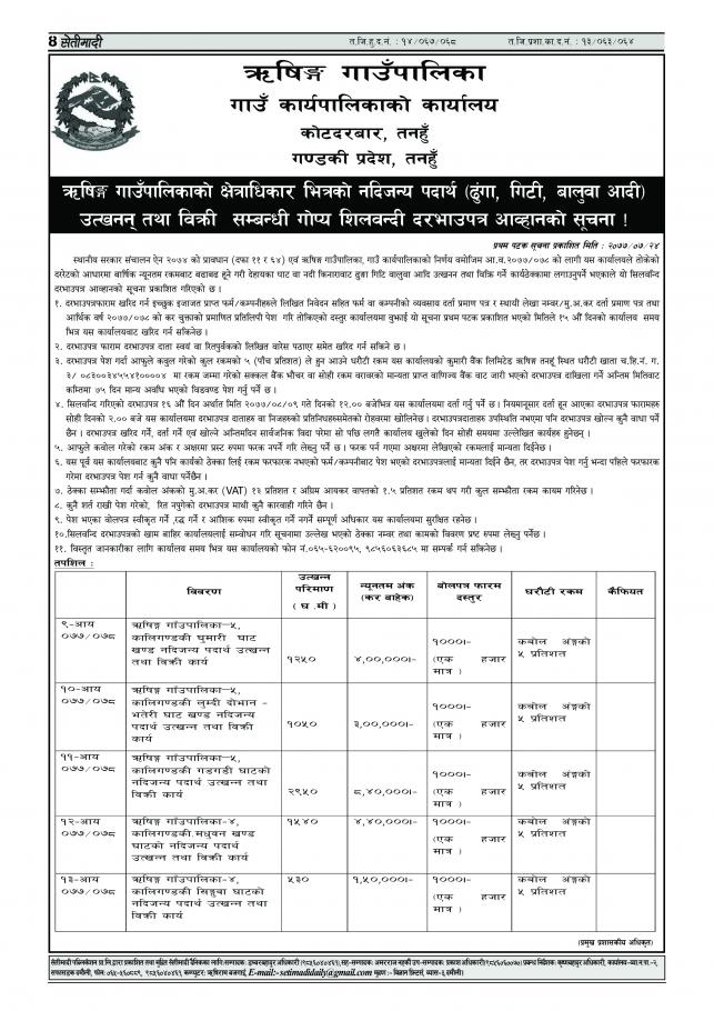 आदी) उत्खनन् तथा विक्री सम्बन्धी गोप्य शिलवन्दी दरभाउपत्र आव्हानको सूचना