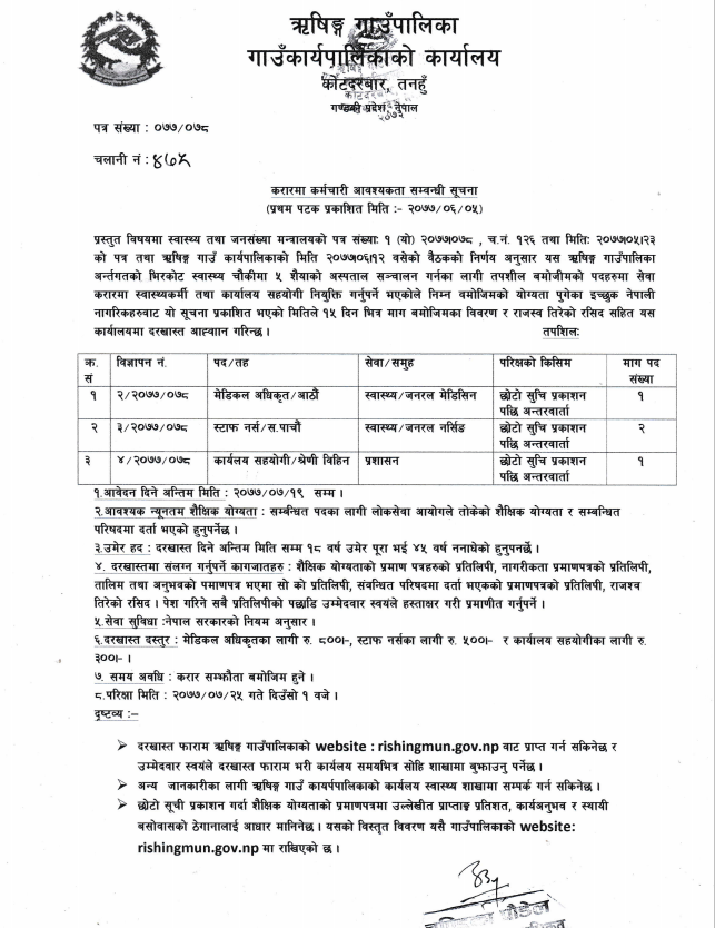 प्रस्तुत विषयमा स्वास्थ्य तथा जनसंख्या मन्त्रालयको पत्र संख्याः १ (यो) २०७७।०७८ , च.नं. १२६ तथा मितिः २०७७।०५।२३ को पत्र तथा ऋषिङ्ग गाउँ कार्यपालिकाको मिति २०७७।०६।१२ वसेको वैठकको निर्णय अनुसार यस ऋषिङ्ग गाउँपालिका अन्र्तगतको भिरकोट स्वास्थ्य चौकीमा ५ शैयाको अस्पताल सञ्चालन गर्नका लागी तपशील बमोजीमको पदहरुमा सेवा करारमा स्वास्थ्यकर्मी तथा कार्यालय सहयोगी नियुक्ति गर्नुपर्ने भएकोले निम्न वमोजिमको योग्यता पुगेका इच्छुक नेपाली नागरिकहरुवाट यो सूचना प्रकाशित भएको मितिले १५ दिन भित्र माग बमोजीमका विवरण र राजस्व तिरेको रसिद सहित यस कार्यलयमा दरखास्त आह्वाान गरिन्छ ।