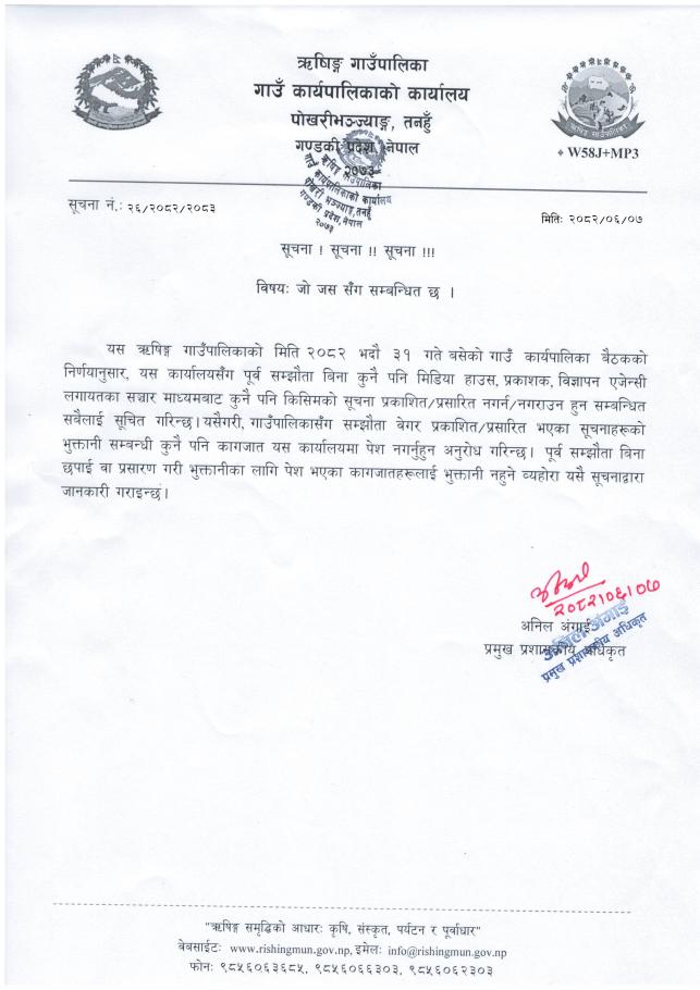 ऋषिङ्ग गा.पा वडा नं. १ (सेतिगण्डकी झापुटार घाट खण्ड)को नदिजन्य पदार्थ उत्खनन तथा विक्री कार्यका लागी बोलपत्र आह्वानको सूचना