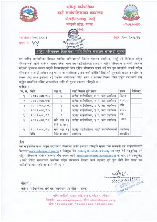 राष्ट्रिय परिचयपत्र वितरणका लागि शिविर सञ्चालन सम्बन्धी सूचना ।