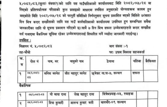 अन्तिम नतिजा प्रकाशन सम्बन्धी सूचना ! (पदः उद्यम विकास सहजकर्ता)